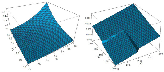 In particular, we shall assume that is the pdf of a Gumbel bivariate exponential distribution truncated on the domain D, and that is a bivariate Pareto pdf defined on , which is left truncated by its nature. Therefore, let and let follow Gumbel’s bivariate distribution (1) truncated on the domain with parameters and having pdf