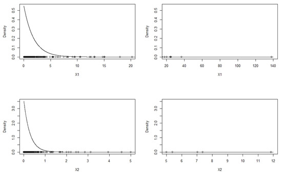 Therefore, the bivariate distribution we propose equals a certain bivariate distribution on one domain and another bivariate distribution on another domain. More precisely, we aim at using a more heavy-tailed bivariate distribution beyond some thresholds, such as the Pareto one. As in the univariate case, the motivation of such a model is to better capture the behavior of dependent random data that present many small and medium pairs of values but also some very large ones; we note that this could be the case with, e.g., insurance or financial data arising from two dependent lines of business. In this sense, we recall the discussions in [5,6], where it was noticed that for the particular bivariate insurance data set under study (consisting of auto claims, property damage costs, and medical expenses), the best globally fitted distribution does not provide the best model for tail risk measures because heavier-tailed distribution is needed.