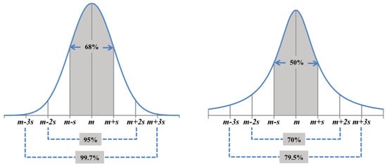 The appropriateness of assuming that given data have a normal distribution is often tested using the well-known empirical observation called the “68%–95%–99.7% rule” of normality illustrated in Figure 1(left). The one key property of a continuous centrally symmetric unimodal distribution that makes it normal is the unique (after rescaling) rate of decrease in its density function away from its mean. The normal density function, discovered by Gauss in 1809 in connection with his studies of astronomical observation errors, decreases from its mean at a rate exactly proportional to and not to or , for example, as is the case for the Laplace and Cauchy distributions, respectively.