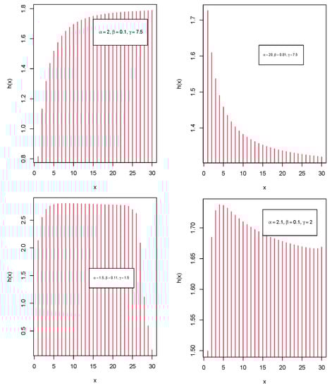 Following (6), it goes without saying that determining the closed form expression of the hrf is more difficult, although, in order to determine the shape of the hrf, we sketch its graph. Figure 2 demonstrates the following facts about the shapes of the hrf of the LZTBD, indicating that the LZTBD has all of the typical shapes, such as increasing, decreasing, and bathtub shapes for varying parameter values.