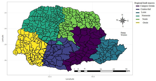 The state of Paraná is located in the southern region of Brazil and has approximately 11,597,484 inhabitants and an approximate area of 199,307,922 km2, according to IBGE [20]. The spatial distribution of health services is represented by twenty-two health regions, which are grouped into six macro-regions of care, located in the east, Campos Gerais, central-south, west, northwest, and north, see SESA [8], as shown in Figure 1.