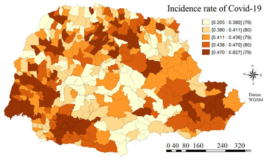 The variable of interest for the study was the incidence rate of cases of the new coronavirus for the month of June to December 2020 whose units of analysis are formed by the three hundred and ninety-nine municipalities that are in the twenty-two regions of health that are part of the municipalities that make up the state of Paraná. The socioeconomic variables associated with the variable of interest were: Gini index, Theil-L index, and municipal human development index (MHDI) see IPARDES [25]. The incidence coefficient of the number of cases was calculated considering the cases that occurred from June 2020 to December 2020, after consulting the Paraná State Health Department (SESA), based on public epidemiological reports, according to Equation (6):