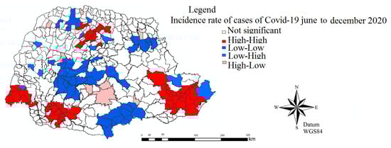Clustering map of the incidence rate of confirmed cases of the new coronavirus by municipalities in Paraná from June 2020 to December 2020, using the Moran local index (LISA).