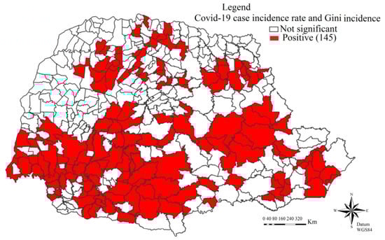 Analyzing Figure 5, it is possible to see that one hundred and forty-five municipalities presented positive clusters for the incidence rate of COVID-19 cases and the Gini index, through the multivariate Geary local index , thus reflecting that the result is suggestive of similarity between these two analyzed variables, in accordance with Anselin [16], noting that the incidence rate of the number of cases is significant in relation to the concentration of income of a particular group of individuals and which points out the difference between the incomes of the poorest populations in relation to the richest populations (Gini index).