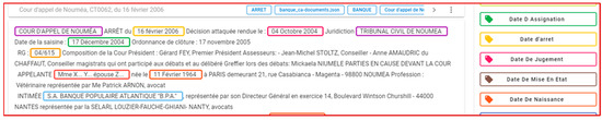 nature d’affaire civile, or NAC) have not been annotated. They are too seldom mentioned by the judge or difficult to recognize, so learning them would prove ineffective. Nor have the names of attorneys been extracted, but [