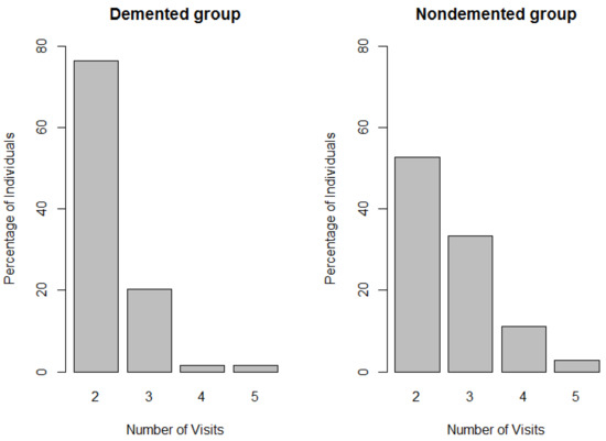 Plot showing distribution of the number of visits in the demented group and the nondemented group of individuals.