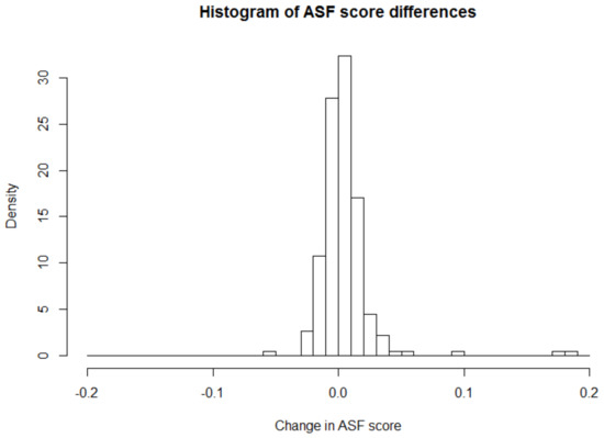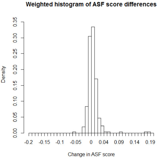 Plot showing inverse cluster size weighted histogram of ASF score differences.