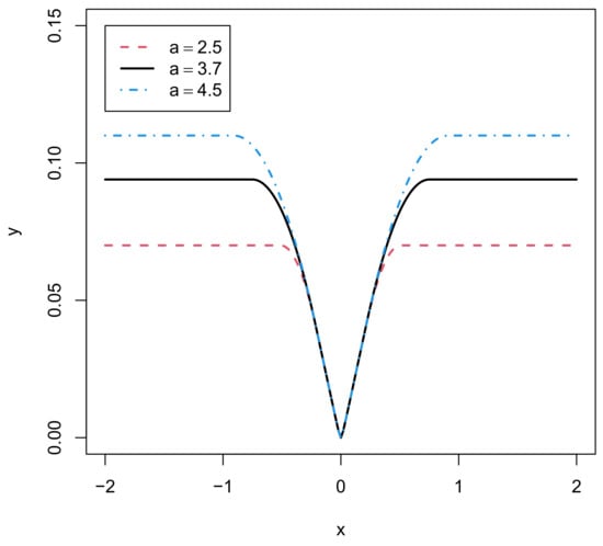 Figure 1 displays the SCAD penalty function for different values of a with a fixed value of 0.2. The SCAD penalty retains the penalization rate and the induced bias of the lasso for model parameters close to zero, but continuously relaxes the rate of penalization as the absolute value of the model parameters increases. Note that has the property of the lasso penalty around zero, but has zero derivatives for x values that strongly differ from zero. In contrast, the derivative of the lasso penalty is 1 or for positive and negative x values, respectively.