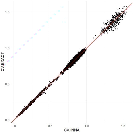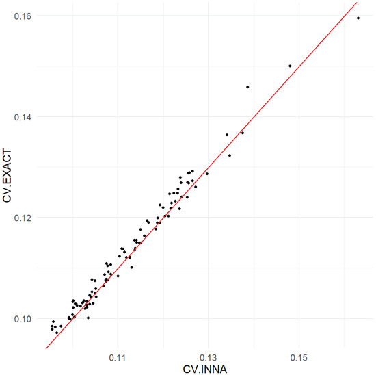 Comparison of the INNA method and the exact method using the CVs of the ward proportions.