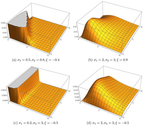 Figure 1 displays the pdfs for several arbitrary values of the parameters. As shown in this figure, the FGMBME distribution has a variety of shapes, making it useful for analyzing bivariate data.