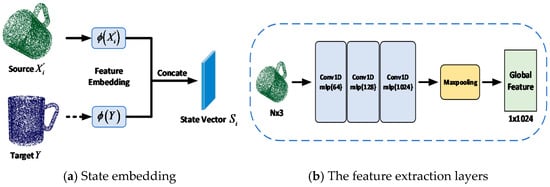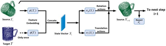 In the process of state embedding, as shown in Figure 2, the target point cloud is the extracted feature at the first step, then generated as . The observed source point cloud is the embedded feature at the beginning of each step. For example, represents the feature vector of the source point cloud in step i. Finally, is concatenated with , and the state vector in step i can be generated as follows: