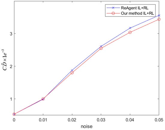 The -noise curve in Figure 5 shows the with different noise magnitudes. It can be seen that the values of obtained by the new method are consistently smaller than ReAgent, indicating that the values of the state embedding used some local features to represent the point cloud, and the heuristic reward function proposed in this paper. Overall, the results confirm the robustness of the new method under different noise levels.
