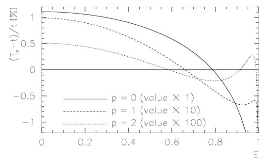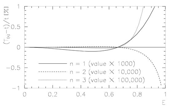 For , the relative deviation from the exact value t was less than , and for , the deviation was less than . Therefore, for , a more precise formula has to be used. As such, higher values for E appeared only in of the cases, so this would not significantly influence the CPU demand.