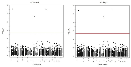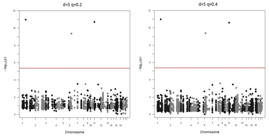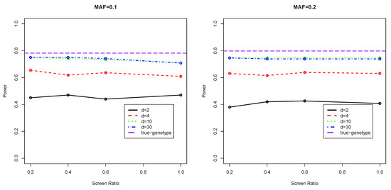 It is critical to control the family-wise Type 1 error in the two-stage approach. The current implementation of our two-stage testing uses the Bonferoni correction with the number of multiple testing (k) equal to the number of genetic markers tested in the first stage, i.e., m. This is because stage one is a preliminary screening procedure for m markers, and stage two is the testing of markers, , so that the total number of multiple testing . Both the Bonferroni correction and the use of multiple testing are conservative. To improve statistical performance, other multiple-test adjustment methods, including the Benjamini–Hochberg procedure [32] and the use of refined formulae for multiple testing k, are under our development as an ongoing project. Intuitively, we considered k as a weighted average between the number of genetic variables in stage one, i.e., m, and the number of testing genetic variables in stage two, i.e., , . A more mathematically rigorous derivation of k in the refined formulae is desired in the future work. In our current implementation, we used the Bonferroni correction with multiple testing . In our study, we evaluated the performance under a range of screening ratios. In practice, we recommend the use of a default screening ratio according to our study. Our current study is only on a sequencing depth . In our ongoing project, we will evaluate the performance under a scenario with a sequencing depth . A different screening ratio will be proposed for the scenario of sequencing depth as part of our ongoing project.