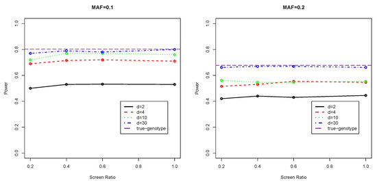 Figure 1 and Figure 2 present the testing powers of our two-stage approach under the various scenarios. We refer to the powers corresponding to screening ratio as full powers as they are obtained when all the genetic regions are genotyped and evaluated via association tests based on genotype calling. As can be seen, the power curves under almost all settings show a fairly flat pattern. With only a proportion () of SNPs of a region selected in stage one and only the selected proportion of markers ( markers) genotyped in Stage two, the use of is only around 10% less powerful than the classical method where all SNPs in the region are genotyped (), which means a considerable saving of computation in genotype calling. Note that the classical method of genotyping all SNPs () is still estimated genotype-based, which is less powerful than the infeasible true genotype-based estimator, which, in theory, has the maximal achievable testing power.