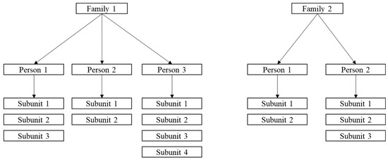 Example of a three-level hierarchy with 2 families and varying numbers of persons per family and subunits per person.