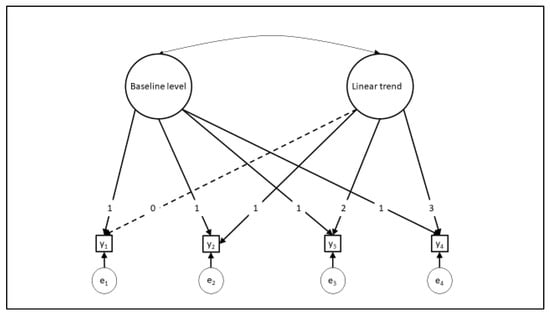 Graphically, we can represent the LGCM using ovals for latent variables and rectangles for the repeated observed measures (Figure 1). Notice that the coefficients emanating from each factor to the measured variable (factor loadings) are fixed values, with the loadings from the baseline level constrained to equal one, meaning that the relationship between the baseline level and the measured variables remains constant across repetitions. Furthermore, the relationship between each measured variable and the linear trend latent variable increase in a linear fashion from the baseline. This can be relaxed, though, allowing the effect of time to be freely estimated []. Finally, the curved arrow connecting the two latent variables represents a correlation.