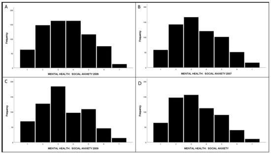 Histograms for the four social anxiety repeated measures (panels (A)–(D)).