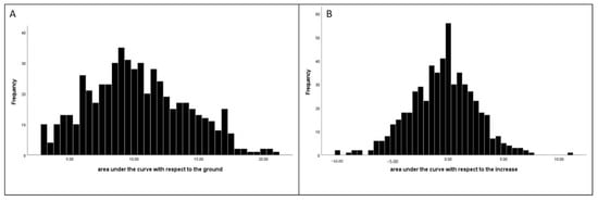Histograms for the AUC-g (panel (A)) and AUC-i (panel (B)).