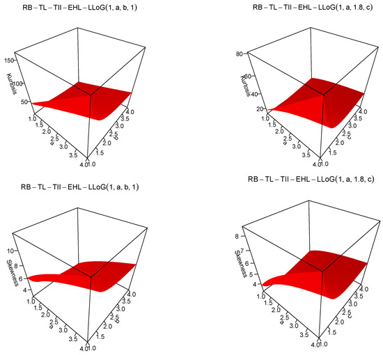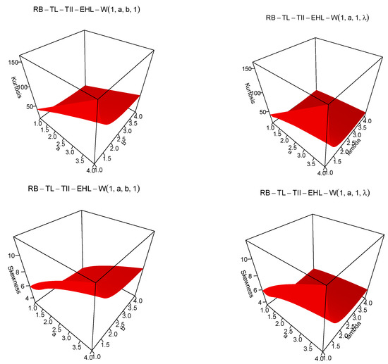 Three-dimensional (3D) plots of skewness and kurtosis for RB-TL-TII-EHL-W distribution.