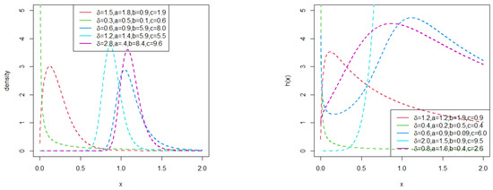 - When we obtain the Topp-Leone-Type II-Exponentiated Half Logistic-G (TL-TII-EHL-G) family of distributions with the cdffor , and parameter vector (see [35]).