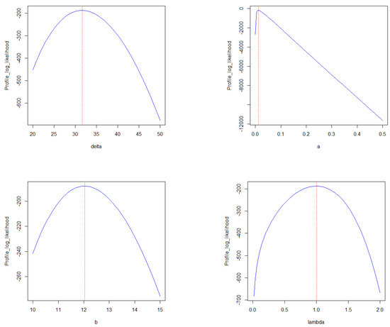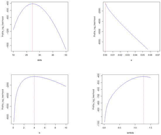 Figure 9 shows the profile likelihood plots for parameters of the RB-TL-TII-EHL-W distribution on the vehicle fatalities data. From the plots, we can see that the MLEs for the parameters of the RB-TL-TII-EHL-W distribution are achieved at single and different points.