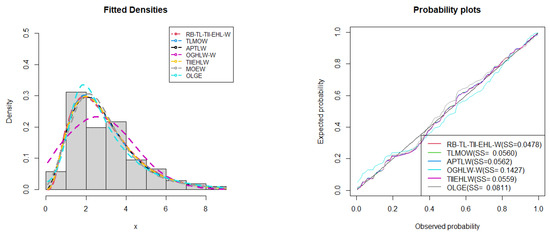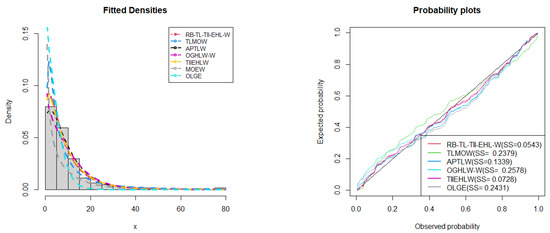 The data analysis results for the COVID-19 data are given in Table 3. Table 3 indicates that the RB-TL-TII-EHL-W distribution has the lowest values of the and largest p-value of the statistic among other fitted models. This implies that the RB-TL-TII-EHL-W can be chosen as the best model for modeling the COVID-19 data. The fitted density plots and the probability plots (Figure 7) show that the RB-TL-TII-EHL-W distribution adequately fits the COVID-19 data.