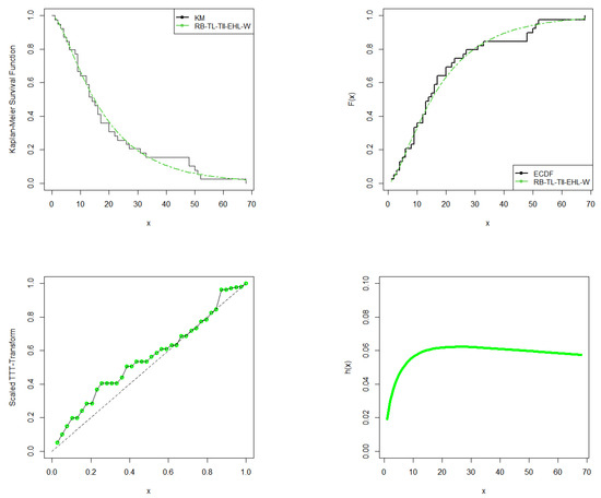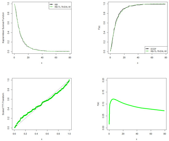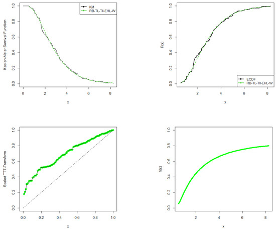 The observed and the fitted Kaplan–Meier survival curves, observed and fitted ECDF, TTT scaled plots and hrf plots of the RB-TL-TII-EHL-W distribution are shown in Figure 14. From the Kaplan–Meier and ECDF plots, it is clear that the RB-TL-TII-EHL-W distribution is a good candidate for modeling the remission times data. The TTT scaled and hrf plots indicate that indeed, the RB-TL-TII-EHL-W distribution is suitable for modeling the remission times data, as they both estimate the hazard rate of the data to be upside-down bathtub.