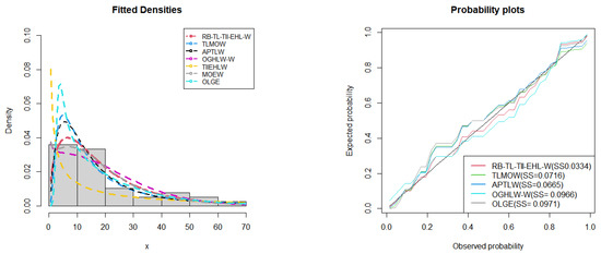 The results are presented in Table 5. From Table 5, it is quite visible that the values of , , , , , are smaller and the p-value of the K-S statistic is largest under the RB-TL-TII-EHL-W distribution, indicating that the RB-TL-TII-EHL-W distribution fits the remission times data better than other fitted distributions. The fitted density plots and the probability plots (Figure 13) show that the RB-TL-TII-EHL-W distribution adequately fits the remission times.
