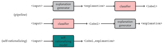 The production of datasets augmented with human-generated explanations gained prominence recently [33,34], enabling explainable NLP work. Indeed, two paradigms emerged: pipeline models (see [35])—one model generates the decision and another the explanation—and self-rationalizing models [9,13]—which jointly output both. This definition is adapted from the work of [11]. These approaches are illustrated in Figure 1. Multiple configurations can be used for pipeline models: input → output → explanation—any post hoc explainability method [17,18,19] can provide a plausible explanation, but its faithfulness is not guaranteed [20]—and input → explanation → output—deemed faithful by construction, as the first model acts as an “evidence extractor” and the prediction model can only rely on this evidence. The main limitation of this latter approach is that the quality of the first model may limit the accuracy of the whole [36].