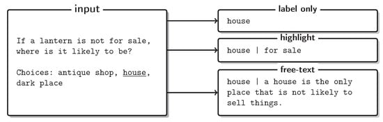 Framing different types of rationale as sequence-to-sequence tasks. Highlighted explanations extract sequences from the input. Free-text explanations have free form. Example from Commonsense Explanation (Cos-E) v1.0, correct label is house.