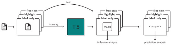 The text-to-text transfer Transformer (T5) model is an approach to multitask learning based on reframing multiple natural language tasks as text-to-text tasks [14]. As a sequence-to-sequence model, it provides a unified framework for different rationale formats—label-only, label + highlights, and label + free-text—as the label and rationale can be presented as a single sequence, thus eliminating the need for adjustments in model architecture. This is illustrated in Figure 2. Such a framework can obtain strong performances [13]. For the present experiments, T5-base was fine-tuned on each dataset and with each rationale configuration, resulting in nine different models. An overview of the methodology is presented in Figure 3. Hyperparameters are constant across these models [11]: drop-out is set to 0.1, batch size to 64, and patience for early stopping to 10. Implementation, software and hardware details are provided in Appendix A. At test time, output sequences are decoded greedily, with a length cut-off set to the 95th percentile of the length of target sequences in the training set (20 for Cos-E; 33 for e-SNLI). The quality assessment of the models is two-fold. First, classification power is measured with accuracy, as answer choices are question-dependent. Second, output validity is assessed according to the following criteria: an answer is deemed valid if it is one of the available choices, a valid highlight is one that is a subsequence of the input, while free-text explanations do not follow any particular structure [8].