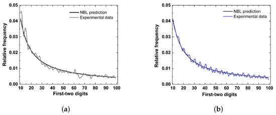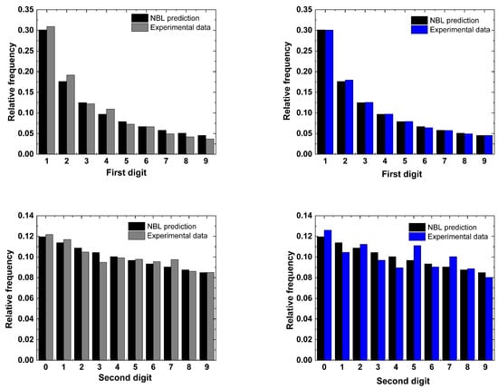 It is worth highlighting that second digit analysis is often performed in the NBL applications. For example, Diekmann documented that articles published in the American Journal of Sociology are well described by taking the second digit [32]. Thus, the probabilities for the appearance of a second digit are given by the expression: