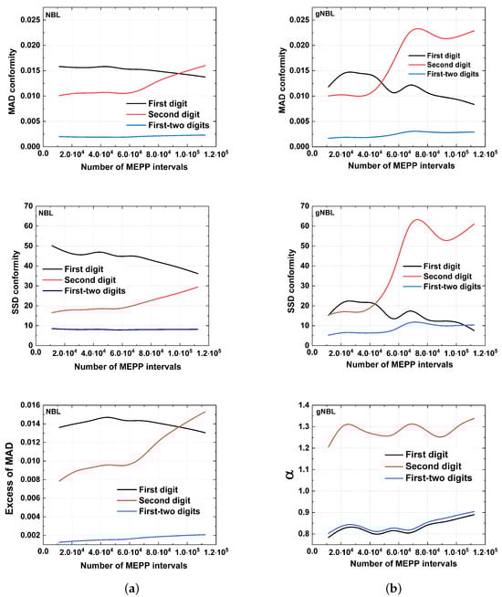 The high number of intervals obtained in some electrophysiological recordings at high offered the possibility of investigating how the level of compliance could be regulated as a function of the number of MEPP intervals. To address this issue, we performed an analysis based on the data cumulative frequency. This procedure divided the experimental data into equal portions within the time series. Next, we successively calculated the conformance level for each data portion. Figure 4 illustrates an analysis made of 112,330 intervals, which gives the conformity behavior considering the adopted tests. In general, for both , the tests revealed fluctuations given by the presence of local conformities and nonconformities until achieving the last interval value, giving the final compliance level. The data studied with the NBL gradually improved the first digit compliance level. This behavior was analogously observed when using the gNBL, where conformity also improved despite the pronounced oscillations. For the second digit, there was a tendency for the level of compliance to be more unstable when the MEPP intervals quantity increased. On the other hand, the results for the first–two digits presented a slight conformity variation, suggesting an attenuated sensitivity concerning the data size.