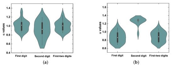 Several authors have reported that fluctuations in the empirical first digit values can also occur, despite the typically asymmetric distribution of digits. This observation implies deviations between the data and the frequency values predicted by the NBL. Evidence corroborating these observations comes from seismic activity and cognition experiments [34,35]. This issue has motivated several authors to propose a generalization of the NBL. In this framework, for instance, one may highlight the theoretical description introduced by Pietronero et al. [36]. According to this author, assuming a probability distribution (where d is the digit(s), D represents arbitrary digits, and is a constant exponent related to the scale proportion), one may write: