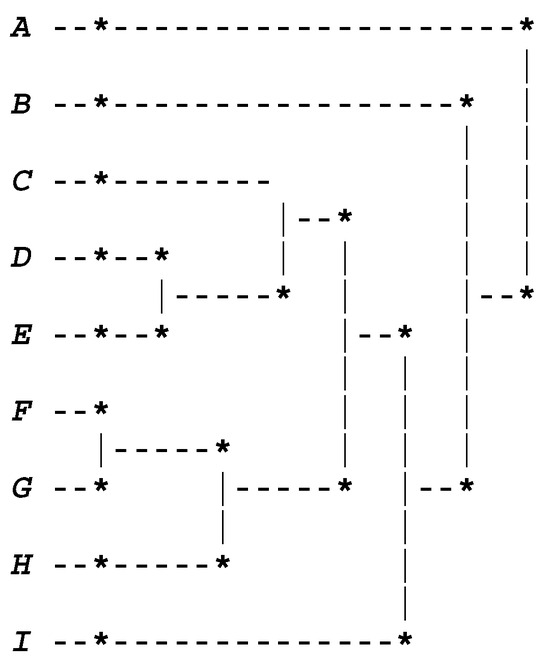 According to the values of the STAT and DIF indexes, provided that the AV1 and AVB methods are being used, the best partition contains four clusters (cutoff at level 5), namely, {A}; {B}; {F, G, E, H, D, C}; and {I}, where the first and second clusters, {A} and {B}, are concerned with the younger crustaceans, and the fourth cluster, {I}, is concerned with older crustaceans (see Figure 1). Thus, these results satisfy the MID property. Moreover, the most atypical cluster is cluster {A}, representing very young abalones, which is in line with what is referred to in [1] (p. 480). Furthermore, based on the empirical evaluation of a list of dissimilarity measures proposed in [1] for a restricted class of symbolic data, namely, Boolean symbolic objects, the authors state the following: “only three dissimilarity measures proposed by de Carvalho, namely, SO_1, SO_2 and C_1, satisfy the MID property” (see [1] (p. 480)). In this context, it should be noted that our clustering results are in accordance with the results of these three measures.