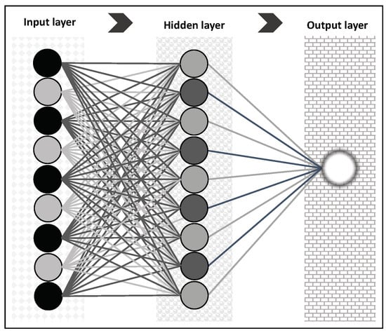 The multilayer perceptron (MLP) model consists of a set of elementary processing elements called neurons [,,,,]. These units are organized in architecture with three layers: the input, the hidden, and the output layers. The neurons corresponding to one layer are linked to the neurons of the subsequent layer. Figure 1 illustrates the architecture of this artificial neural network with one hidden layer. The non-linear function represents the output of the model, where is the input signal and is its parameter vector. For a three-layer ANN (one hidden layer), the kth output computation is given by the following equation: