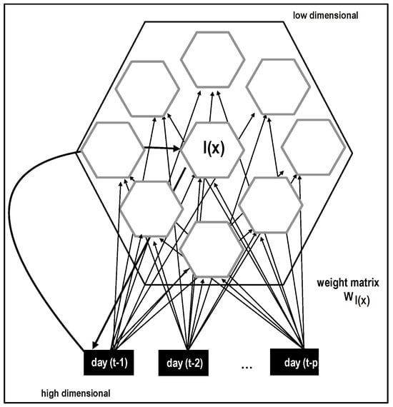 The SOM, introduced by T. Kohonen [], is an artificial neural network with unsupervised learning. The model projects the topology mapping from the high-dimensional input space into a low-dimensional display (see Figure 2). This model and its variants have been successfully applied in several areas [].