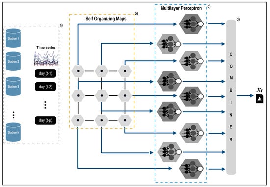 Proposed self-organized topological multilayer percepton. In the first stage (a), time series are collected from the monitoring stations. In the second stage (b), the self-organizing maps find similar topologies in each monitoring station (complemented by other clustering methods, such as elbow, Calinski–Harabasz, and gap). In the third stage (c), the SOM projects the time segments, and this generates the formation of clusters. An MLP is trained to predict each unit’s extreme values for the next day. In the fourth stage (d), a combiner of the best results of the previous stage is evaluated.