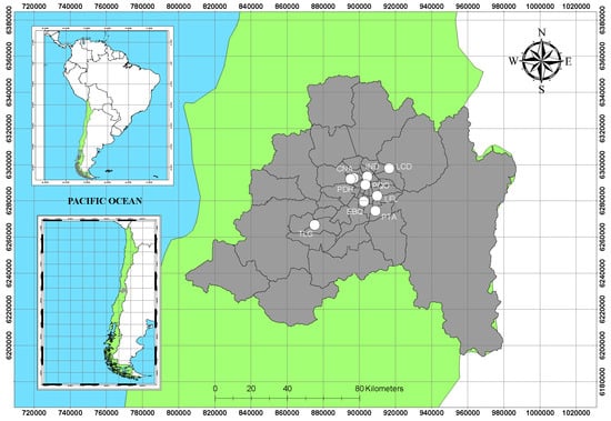 Nine stations belonging to the National Air Quality Information System (SINCA) are located in different locations throughout the metropolitan area of Santiago. These stations constantly monitor pollution contaminants and meteorological conditions of the air. Based on the concentration level of PM measured by m of air, air quality is classified into five levels as shown in Table 1. Regulations assert that when the average concentrations during the last 24 hours are classified at Level 3 or higher, restrictions to emissions must be applied immediately. The map of Santiago, Chile shown in Figure 4 contains the locations of the monitoring stations; it was obtained by using the Arcgis 10.4.1 software (https://n9.cl/arcgis-chile), accessed on 21 October 2023, using shapefiles from South America, including the Pacific Ocean, and other countries.