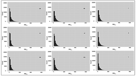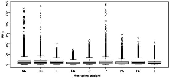 The behavior of the contaminant for each monitoring station is summarized in the histograms and boxplots of Figure 5 and Figure 6, respectively. In general, as can be seen in these figures, they present a probability distribution with a heavy tail, which is evidenced by the appearance of high-contamination episodes. The average PM in CNA is 31.49 ± 30.22 g/m (Table 2), which indicates a certain decrease in contamination compared to the results in the study carried out in [] during the years of 2010–2012.
