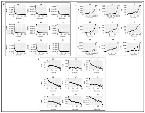 (a) Elbow method, (b) Calinski-Harabasz index and (c) Gap method to determine the optimal number of clusters. It is observed that the three methods converge in determining that the optimal number of centroids is nine.