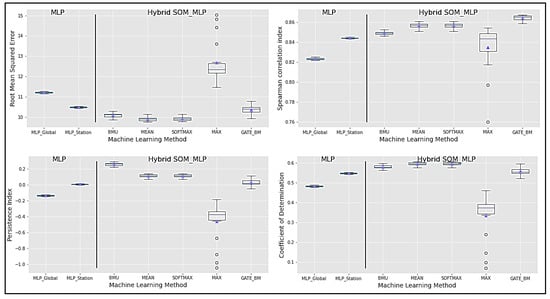 Performance metrics obtained with the models for the 75th percentile, for the global MLP model, the MLP constructed for each station, and the SOM-MLP hybrid model. The model with the best performance is the SOM-MLP hybrid model with the GATE_BMU.