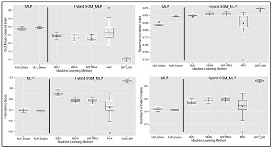 Performance of each model (Mean ± SD): global MLP model, MLP constructed for each station, and the SOM-MLP hybrid model with 4, 9, and 25 neurons.