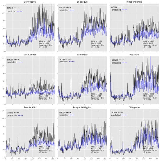 Figure 8 and Figure 9 show the boxplots of the performance metric for each gate for the 75th and 90th percentiles, respectively. Among these are the RMSE, the Spearman correlation index, and the coefficient of determination. For the 90th percentile, it is observed that the GATE_BM is the one with the best performance. It is highlighted that, in extreme values, it is convenient to use the GATE_BM, which does not happen for the 75th percentile since other operators such as BMU, mean, and softmax are suitable in this scenario. Table 4, Table 5, Table 6 and Table 7 report the performances of the models. Furthermore, Figure 10 and Figure 11 show the behavior of the MLP-Station and the hybrid model for each monitoring station, respectively. The highest values of the model fit are observed at the El Bosque, La Florida and Talagante monitoring stations.