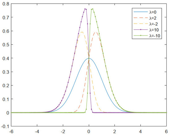 where and are the standard normal density and distribution, respectively, and and are real numbers. The parameter controls skewness, where positive (negative) values denote positive (negative) skewness. Figure 1 shows the skew normal distribution for several values of The SN class has some basic properties:
