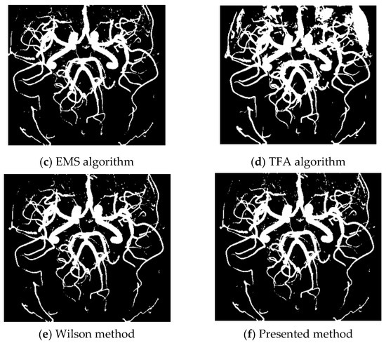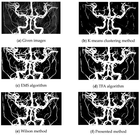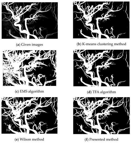 In this example, a 512 × 512 TOF-MRA Circle of Willis coronal image of the carotid vascular system is taken into consideration. Various methods, including K-means, EMS, TFA, Wilson, and the presented method, are used for vessel extraction.
