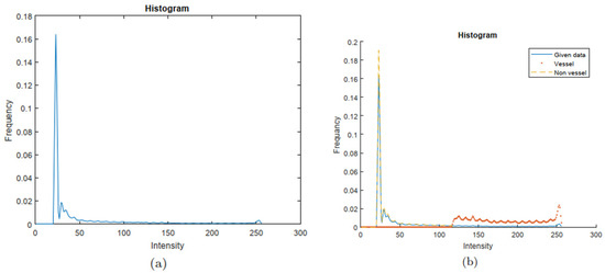 Histogram plots. (a) Histogram plots of data distributions for a brain MRA image data of Example 2; (b) histogram plots of given data, vessel, and non-vessel distributions by applying our algorithm.