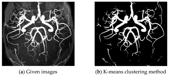 Figure 4b displays the result of vessel extraction using the K-means clustering method, which fails to capture most of the vessels.