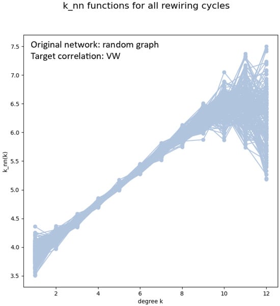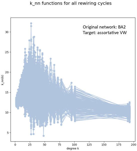 Moreover, at the end of each sub-cycle the k ¯ n n ( k ) function of the current rewired network G2 is computed with the command knn=nx.average_degree_connectivity(G2,...) and accumulated into a dictionary knn1= dict(sorted(knn.items())) for subsequent evaluation of its final average. All the graphs of k ¯ n n ( k ) for each sub-cycle are plotted together in a “cloud” graph which gives a visual impression of their fluctuations. Finally, the ensemble average of k ¯ n n ( k ) and the target k ¯ n n ( k ) are plotted for comparison. The final size of the giant connected component is also computed.